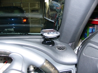ソーラーレーダー探知機をダッシュボード右側(右ハンドル車)のAピラー横に装着。 目線にも入らずキャンセルがやりやすく正解です。 このレーダーは中・高機能機でやはりヤフオクでオークションを利用し7千円程でゲットしました。